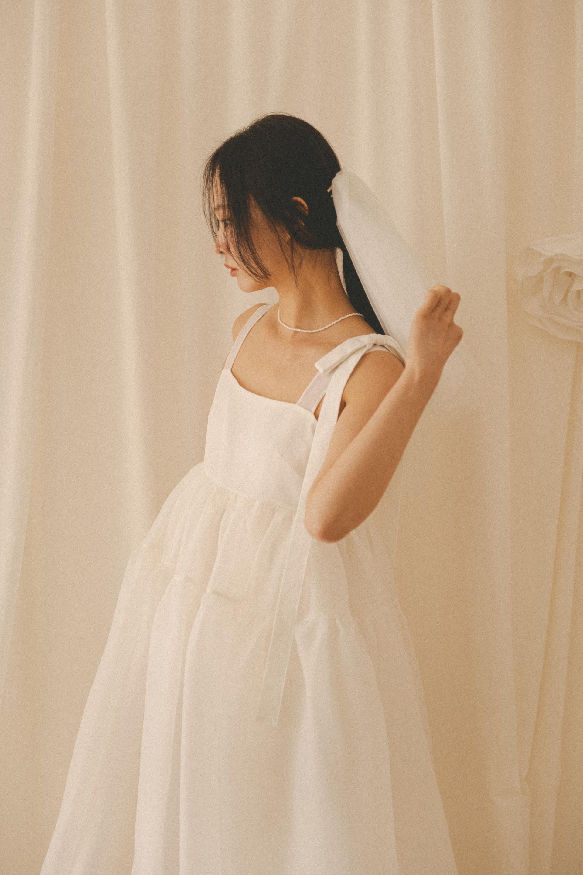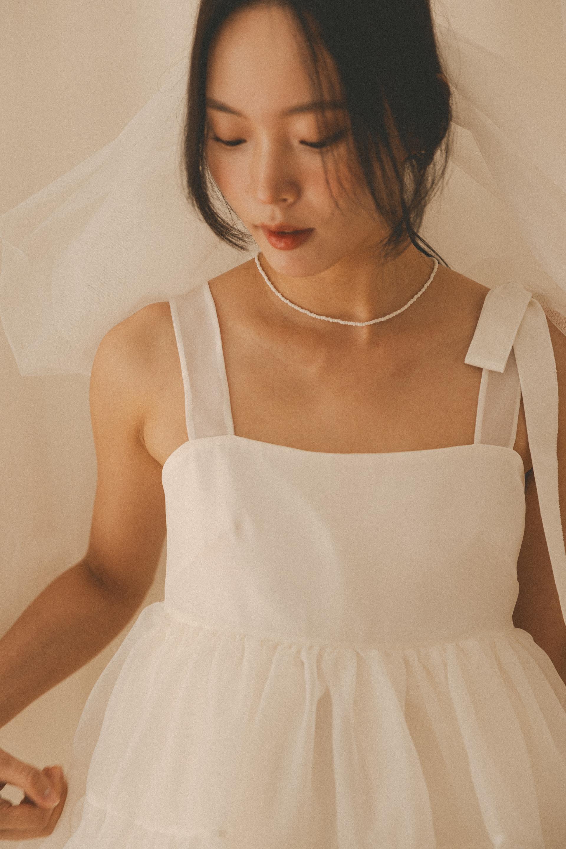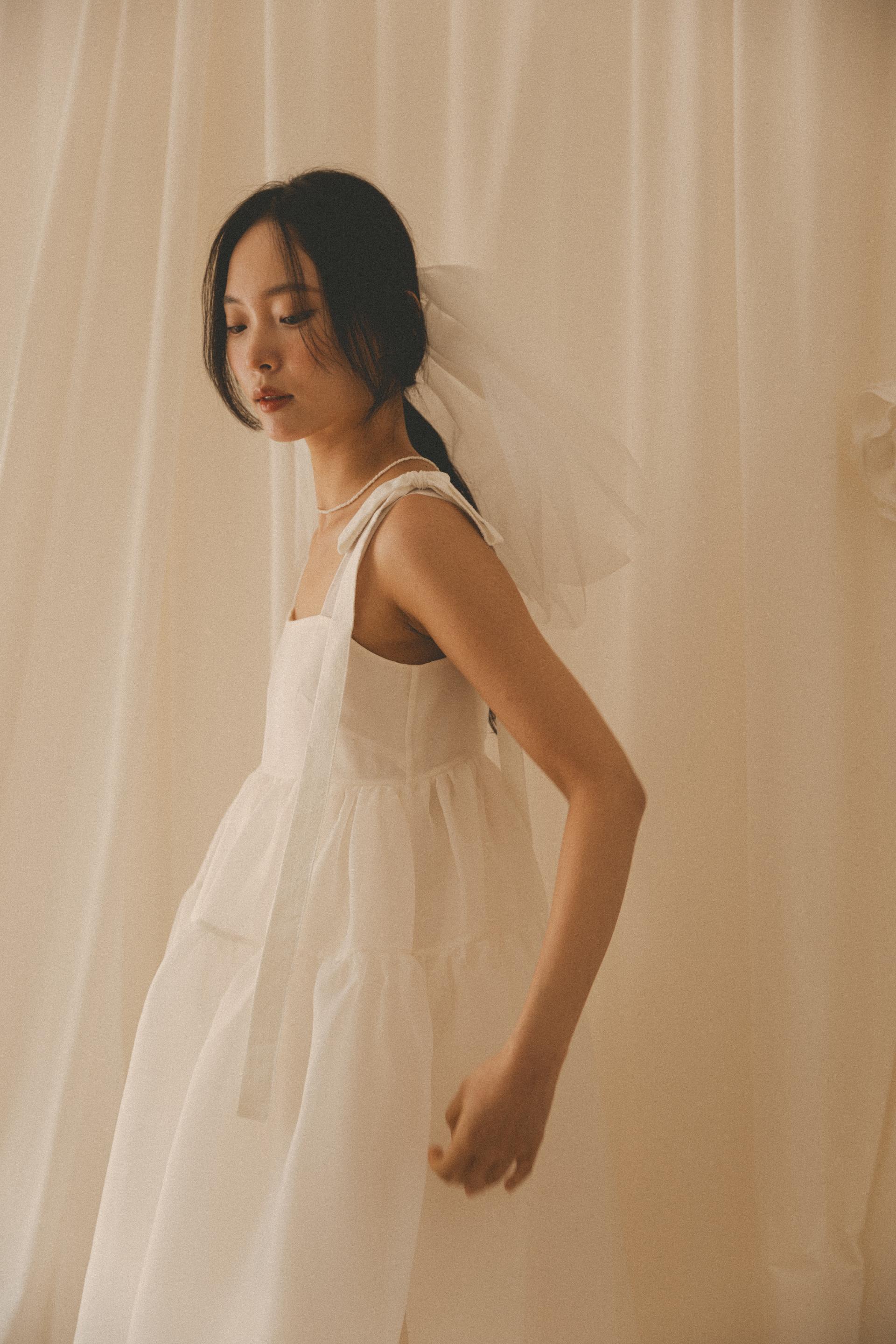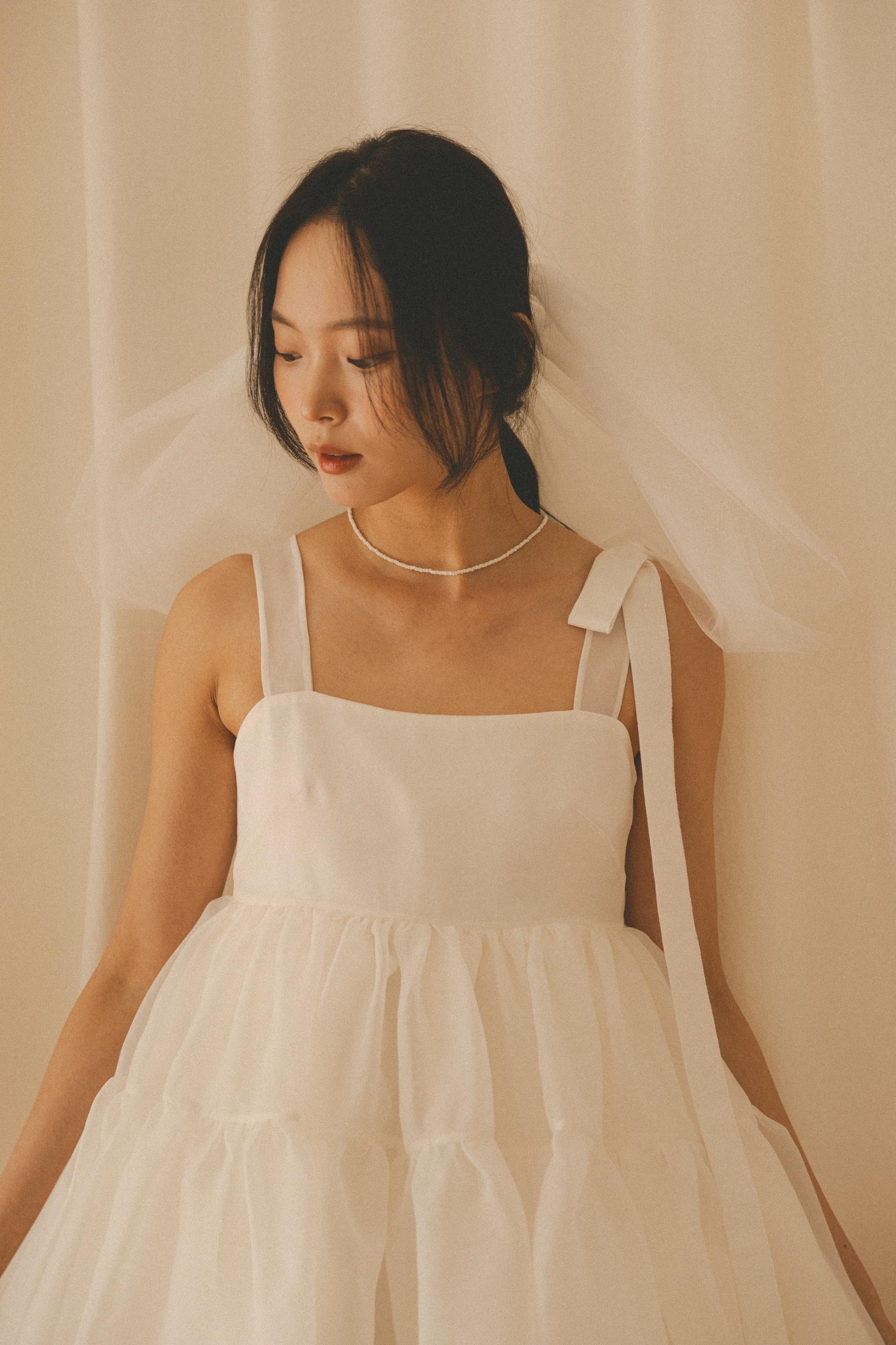 빛의 이름을 가진 리오라 드레스. 햇살이 스며드는 정원의 한가운데, 바람에 스치는 나뭇잎처럼 부드럽고, 움직일 때마다 스스로를 꽃처럼 피워내는 실루엣의 리오라는 히브리어로 *나의 빛*을 의미합니다. 리오라는 그 이름처럼, 가장 찬란해야 할 하루를 부드럽고 따뜻하게 감싸 줍니다. 과하지 않은 리본 디테일, 풍성하지만 가볍게 흩날리는 볼륨, 발목 위로 머무르는 편안한 기장감. 3단 후크 마감 등으로 디테일에 신경쓰며 퀄리티 봉제와 손바느질로 완성했습니다. 불필요한 군더더기를 덜어내고, 우아함으로 채운 이 드레스는 격식을 내려놓고, 자유롭고 편안한 아름다움을 원하는 신부에게 어울립니다. 가슴사이즈가 보통이신 분께 잘 어울리며, 하체의 체형에 구애받지 않는 풍성한 실루엣은 당신이 움직이는 순간을 통하여 비로소 완성됩니다.