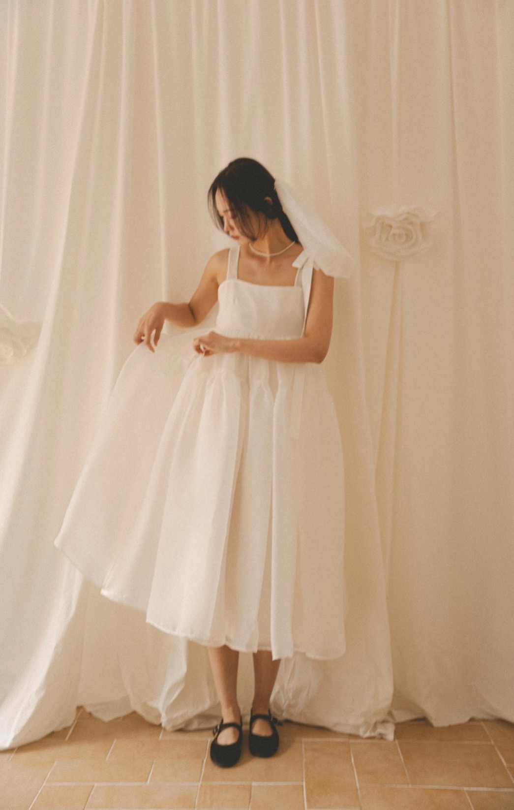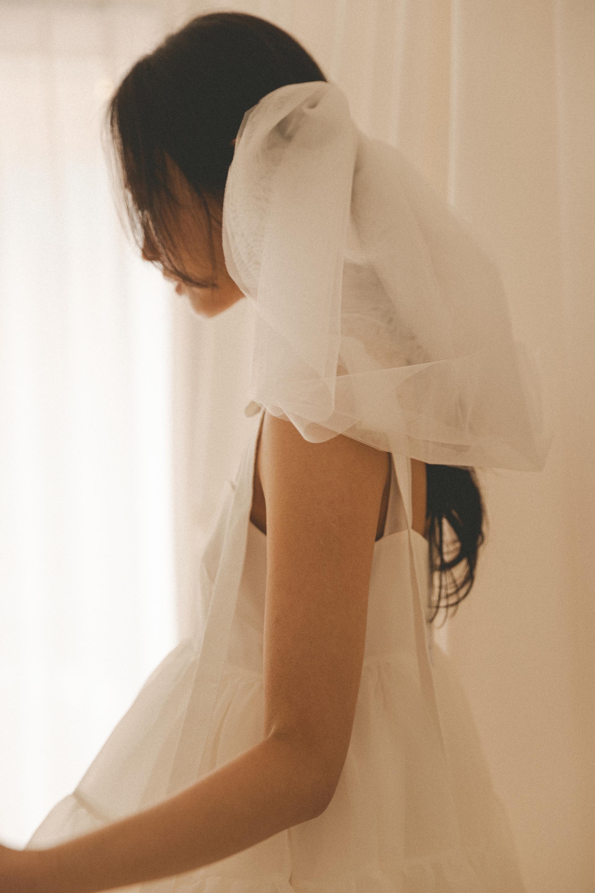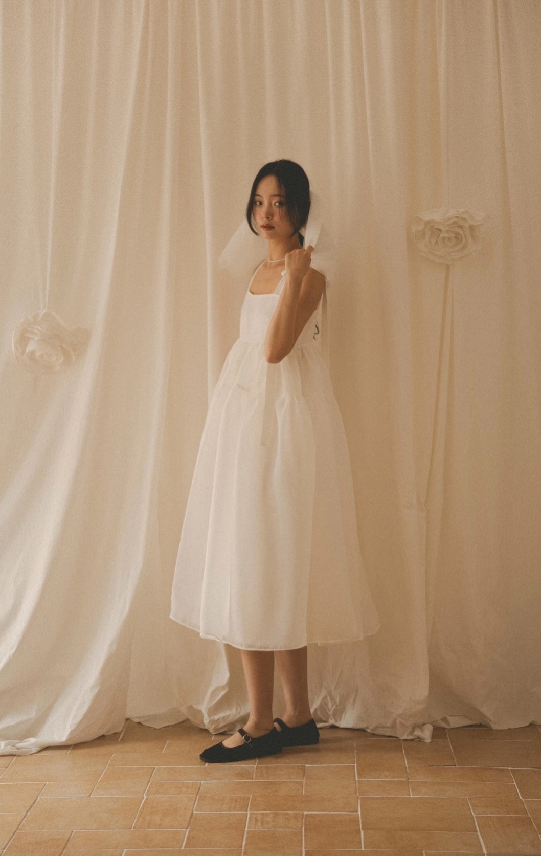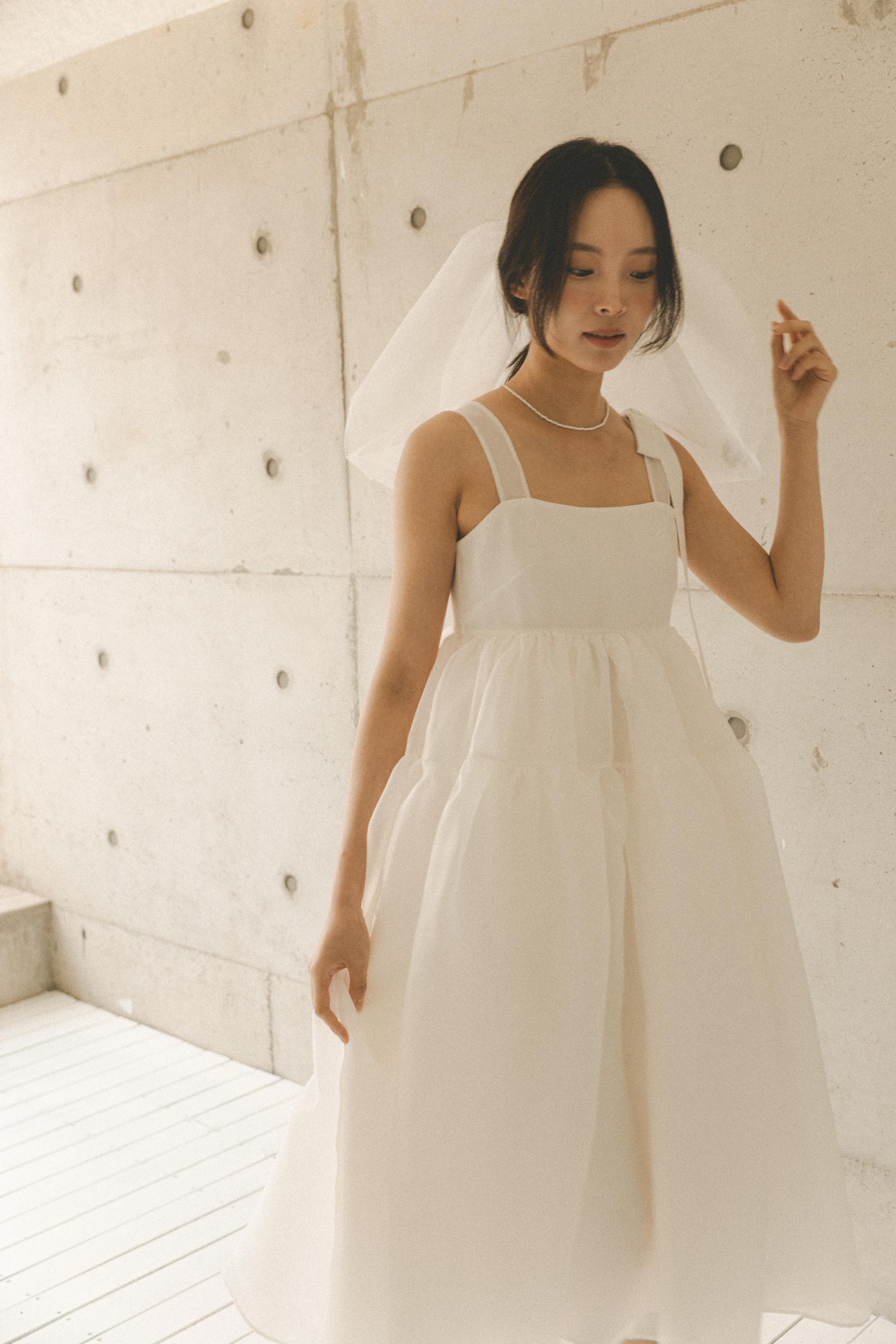 빛의 이름을 가진 리오라 드레스. 햇살이 스며드는 정원의 한가운데, 바람에 스치는 나뭇잎처럼 부드럽고, 움직일 때마다 스스로를 꽃처럼 피워내는 실루엣의 리오라는 히브리어로 *나의 빛*을 의미합니다. 리오라는 그 이름처럼, 가장 찬란해야 할 하루를 부드럽고 따뜻하게 감싸 줍니다. 과하지 않은 리본 디테일, 풍성하지만 가볍게 흩날리는 볼륨, 발목 위로 머무르는 편안한 기장감. 3단 후크 마감 등으로 디테일에 신경쓰며 퀄리티 봉제와 손바느질로 완성했습니다. 불필요한 군더더기를 덜어내고, 우아함으로 채운 이 드레스는 격식을 내려놓고, 자유롭고 편안한 아름다움을 원하는 신부에게 어울립니다. 가슴사이즈가 보통이신 분께 잘 어울리며, 하체의 체형에 구애받지 않는 풍성한 실루엣은 당신이 움직이는 순간을 통하여 비로소 완성됩니다.