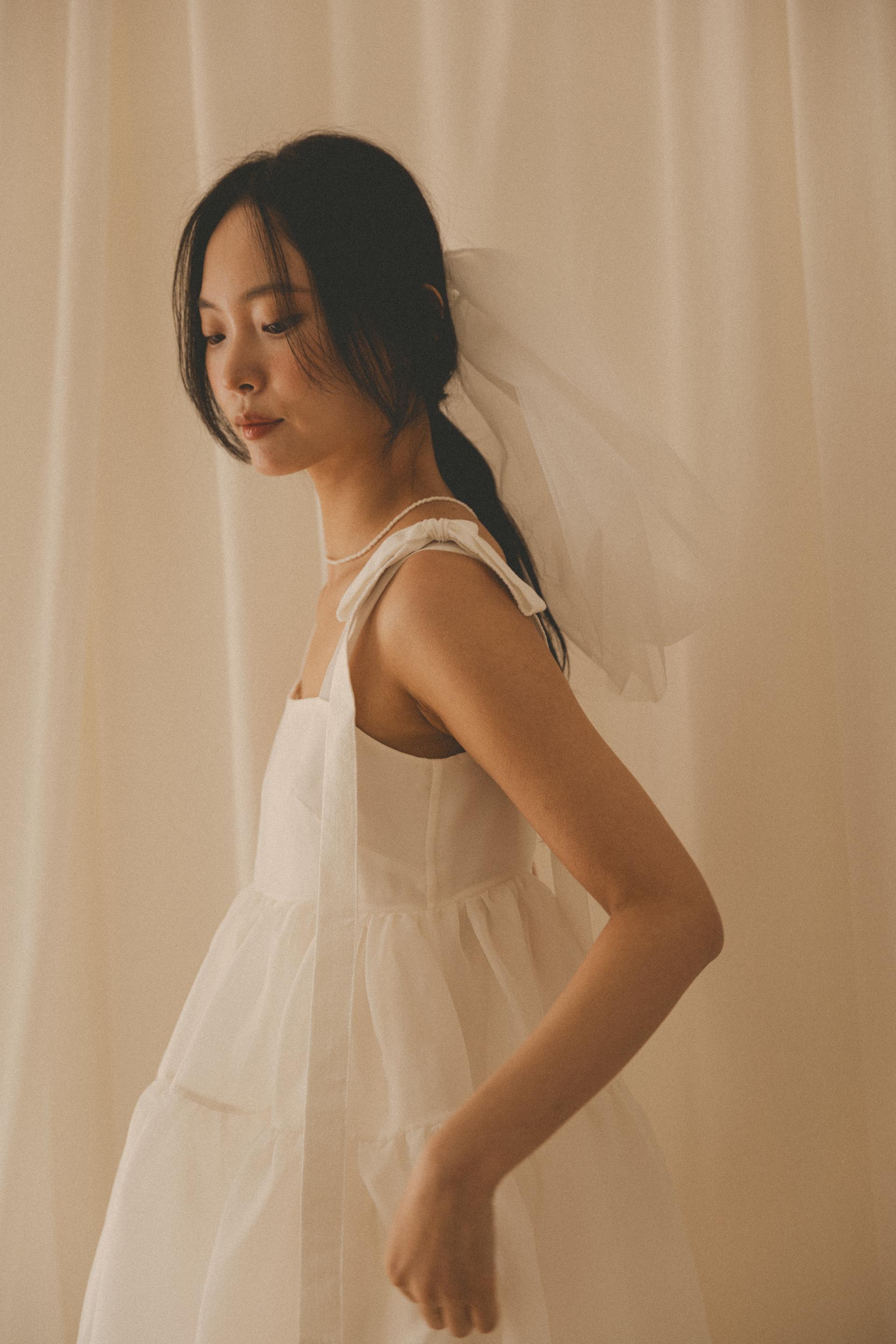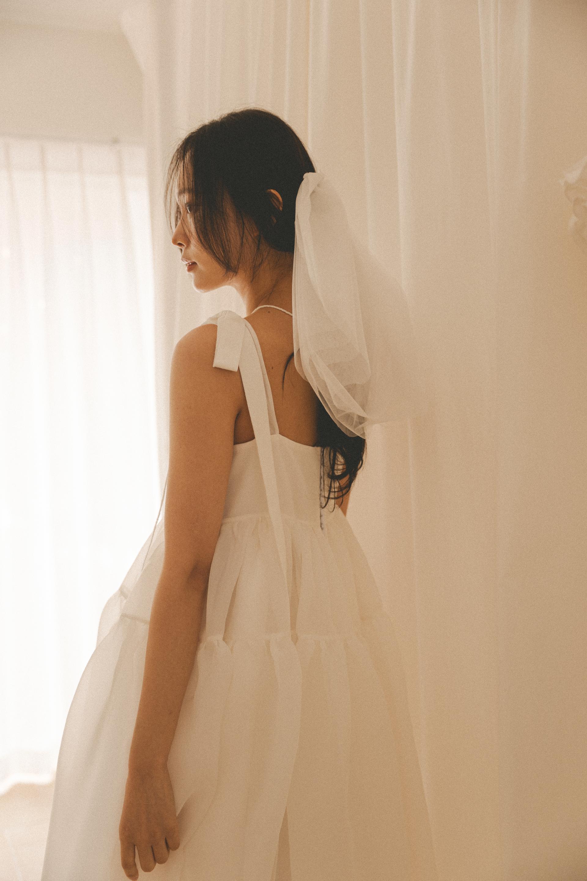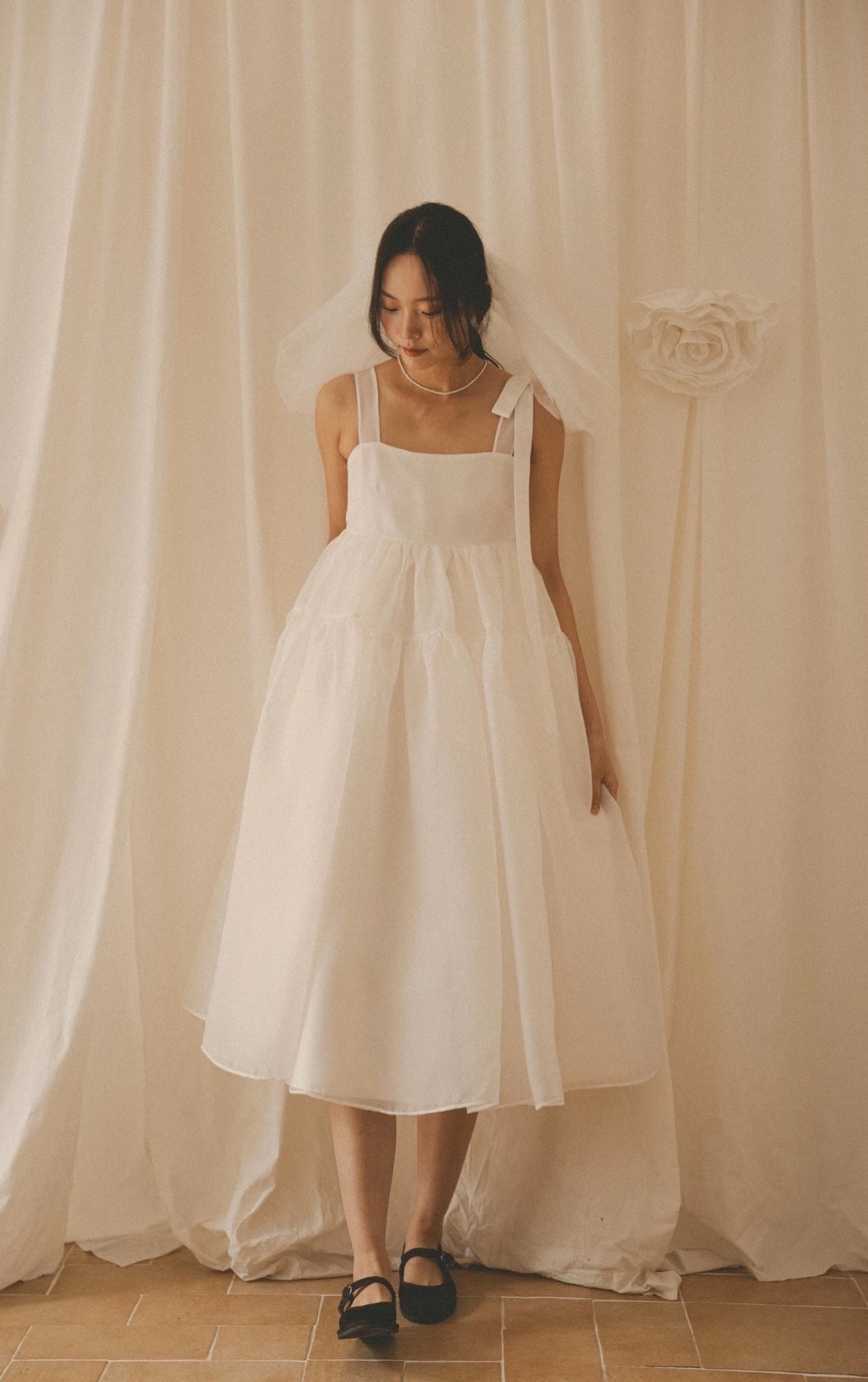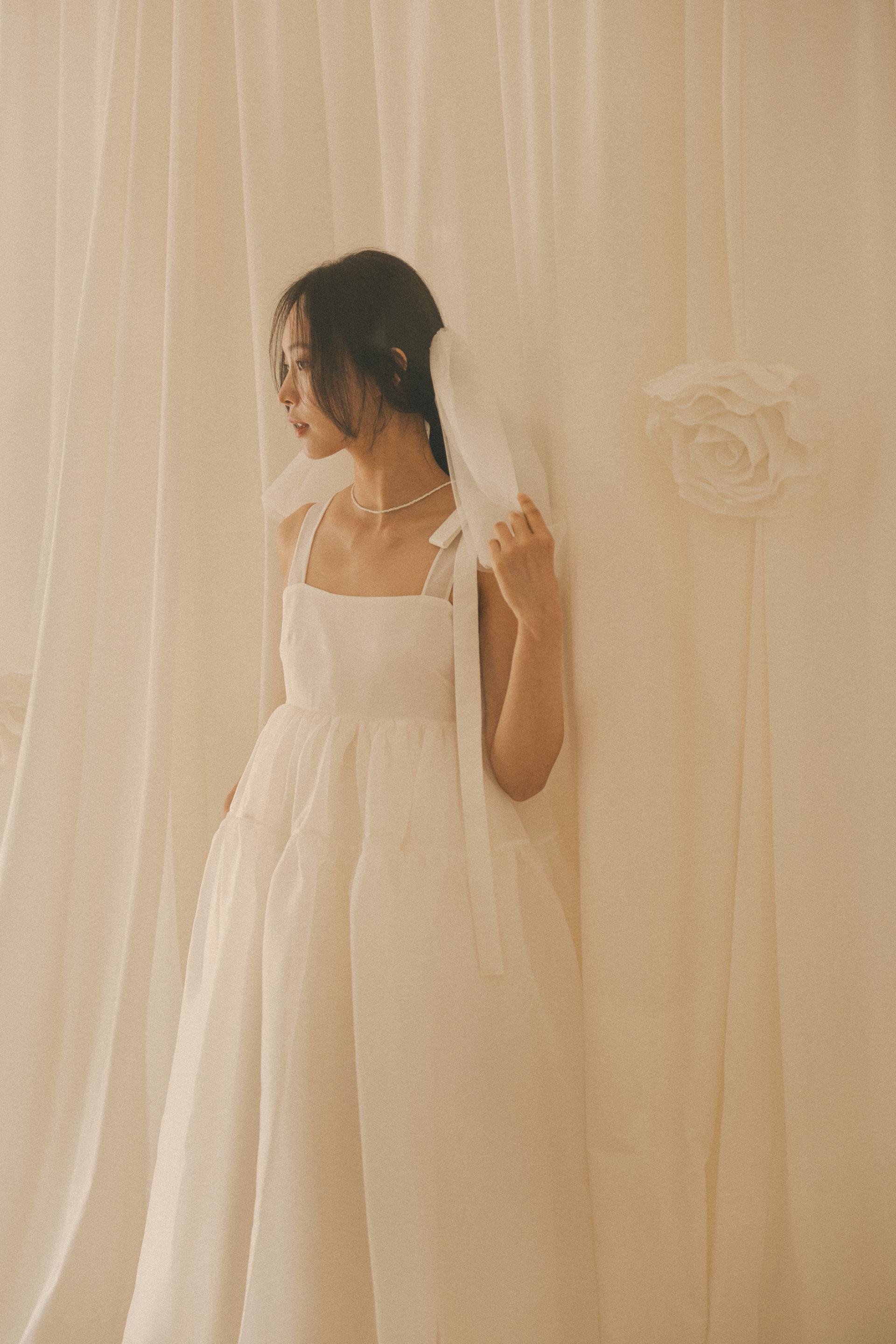 빛의 이름을 가진 리오라 드레스. 햇살이 스며드는 정원의 한가운데, 바람에 스치는 나뭇잎처럼 부드럽고, 움직일 때마다 스스로를 꽃처럼 피워내는 실루엣의 리오라는 히브리어로 *나의 빛*을 의미합니다. 리오라는 그 이름처럼, 가장 찬란해야 할 하루를 부드럽고 따뜻하게 감싸 줍니다. 과하지 않은 리본 디테일, 풍성하지만 가볍게 흩날리는 볼륨, 발목 위로 머무르는 편안한 기장감. 3단 후크 마감 등으로 디테일에 신경쓰며 퀄리티 봉제와 손바느질로 완성했습니다. 불필요한 군더더기를 덜어내고, 우아함으로 채운 이 드레스는 격식을 내려놓고, 자유롭고 편안한 아름다움을 원하는 신부에게 어울립니다. 가슴사이즈가 보통이신 분께 잘 어울리며, 하체의 체형에 구애받지 않는 풍성한 실루엣은 당신이 움직이는 순간을 통하여 비로소 완성됩니다.