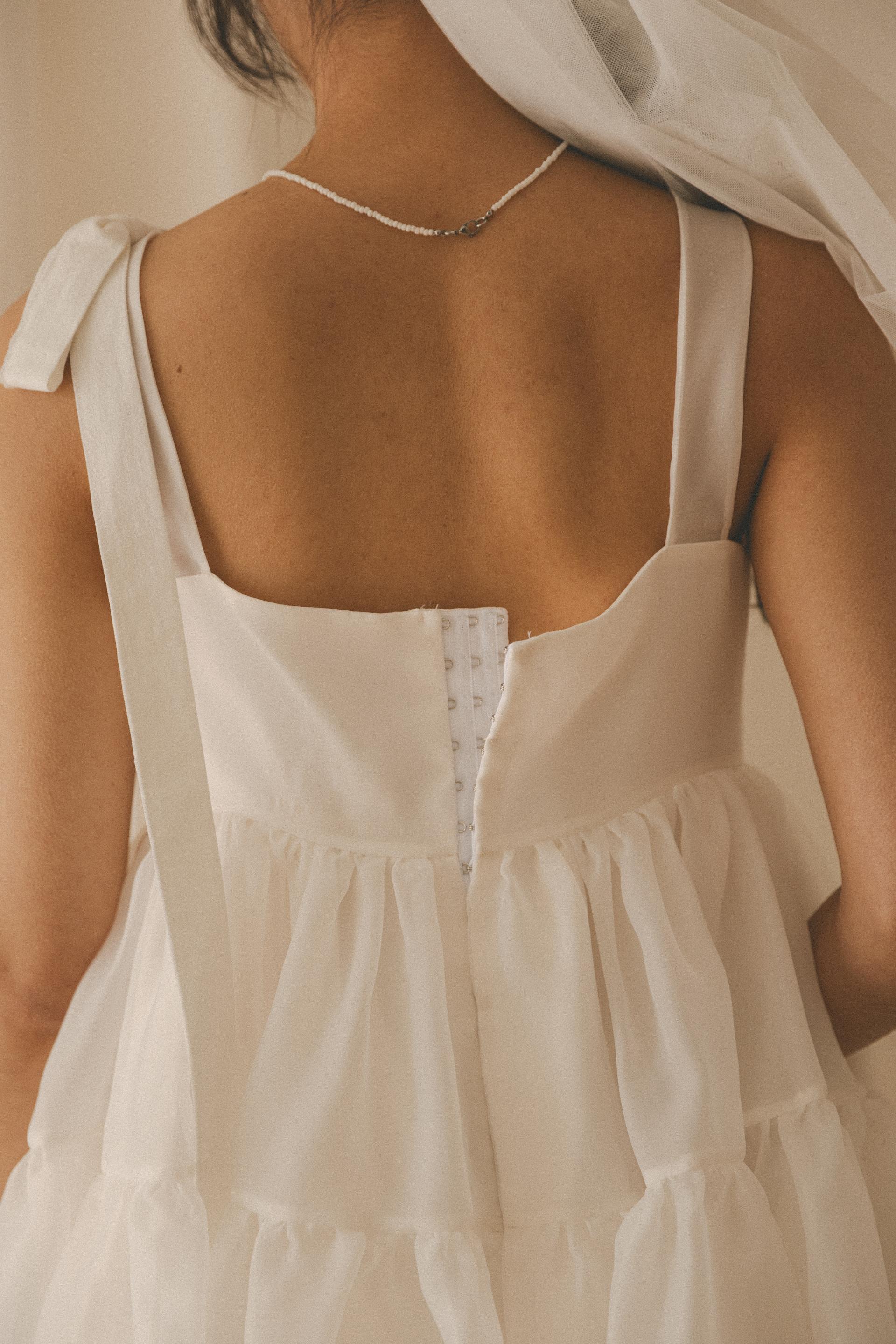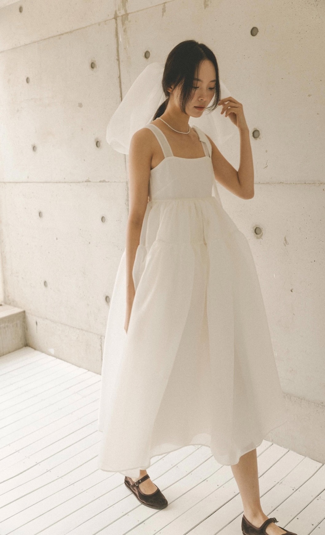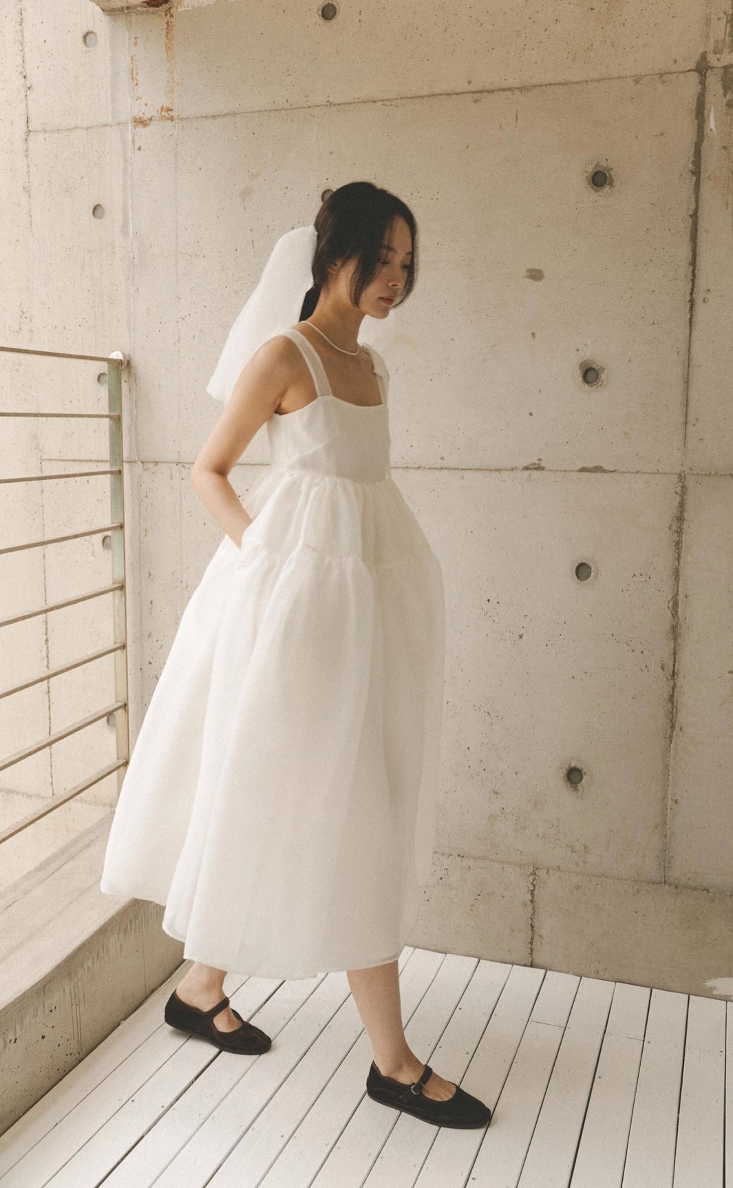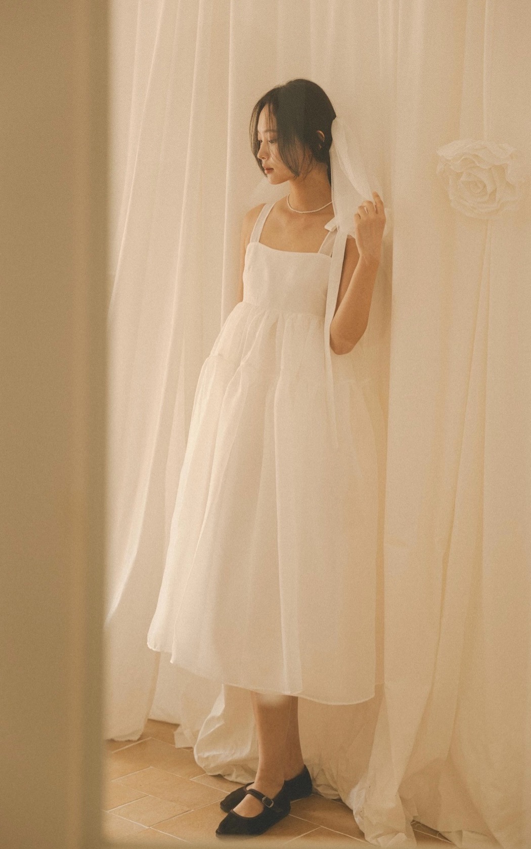 빛의 이름을 가진 리오라 드레스. 햇살이 스며드는 정원의 한가운데, 바람에 스치는 나뭇잎처럼 부드럽고, 움직일 때마다 스스로를 꽃처럼 피워내는 실루엣의 리오라는 히브리어로 *나의 빛*을 의미합니다. 리오라는 그 이름처럼, 가장 찬란해야 할 하루를 부드럽고 따뜻하게 감싸 줍니다. 과하지 않은 리본 디테일, 풍성하지만 가볍게 흩날리는 볼륨, 발목 위로 머무르는 편안한 기장감. 3단 후크 마감 등으로 디테일에 신경쓰며 퀄리티 봉제와 손바느질로 완성했습니다. 불필요한 군더더기를 덜어내고, 우아함으로 채운 이 드레스는 격식을 내려놓고, 자유롭고 편안한 아름다움을 원하는 신부에게 어울립니다. 가슴사이즈가 보통이신 분께 잘 어울리며, 하체의 체형에 구애받지 않는 풍성한 실루엣은 당신이 움직이는 순간을 통하여 비로소 완성됩니다.