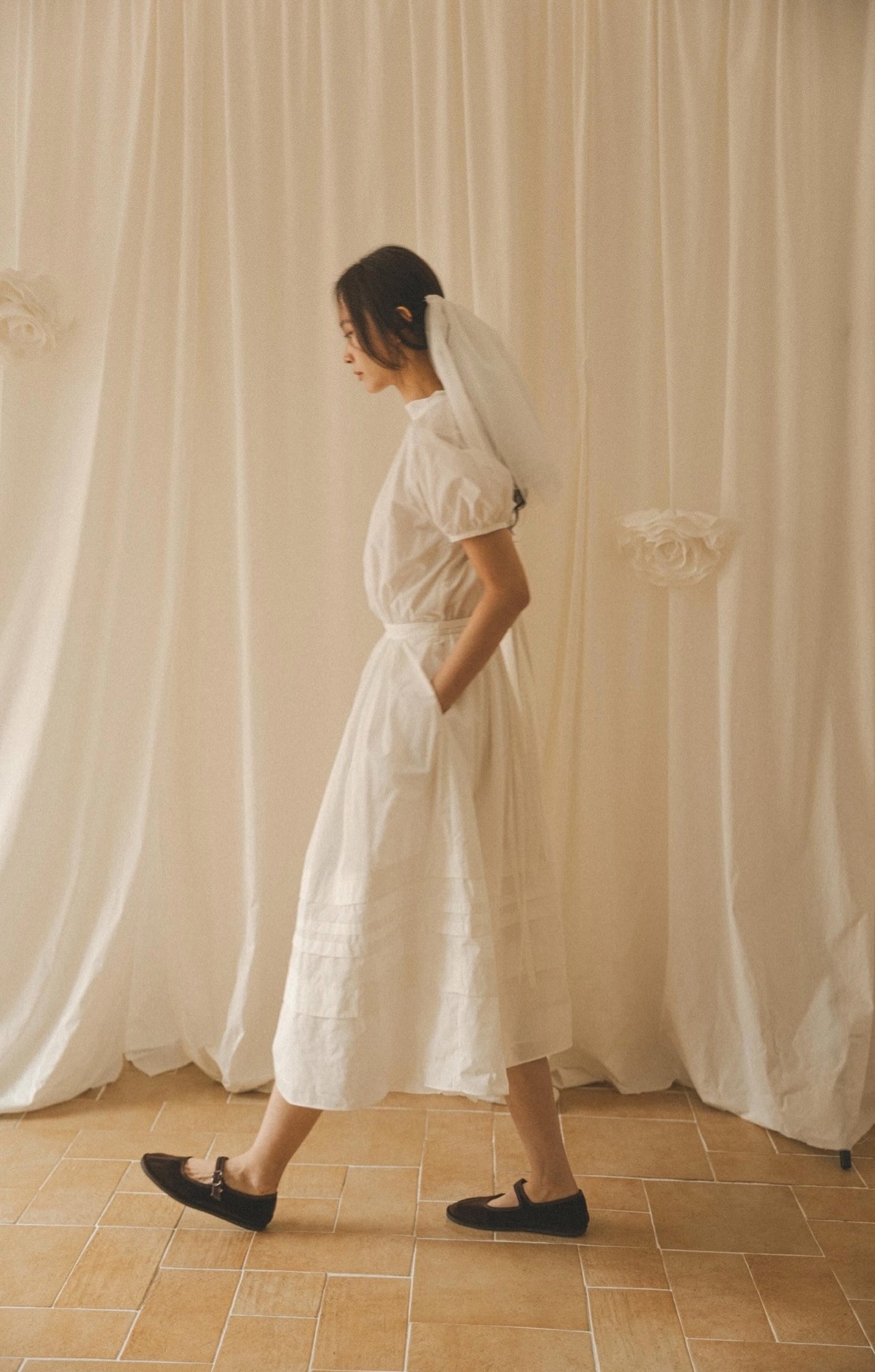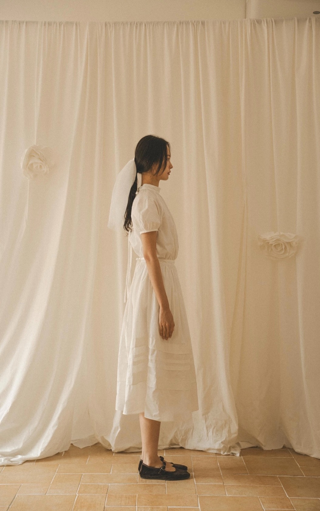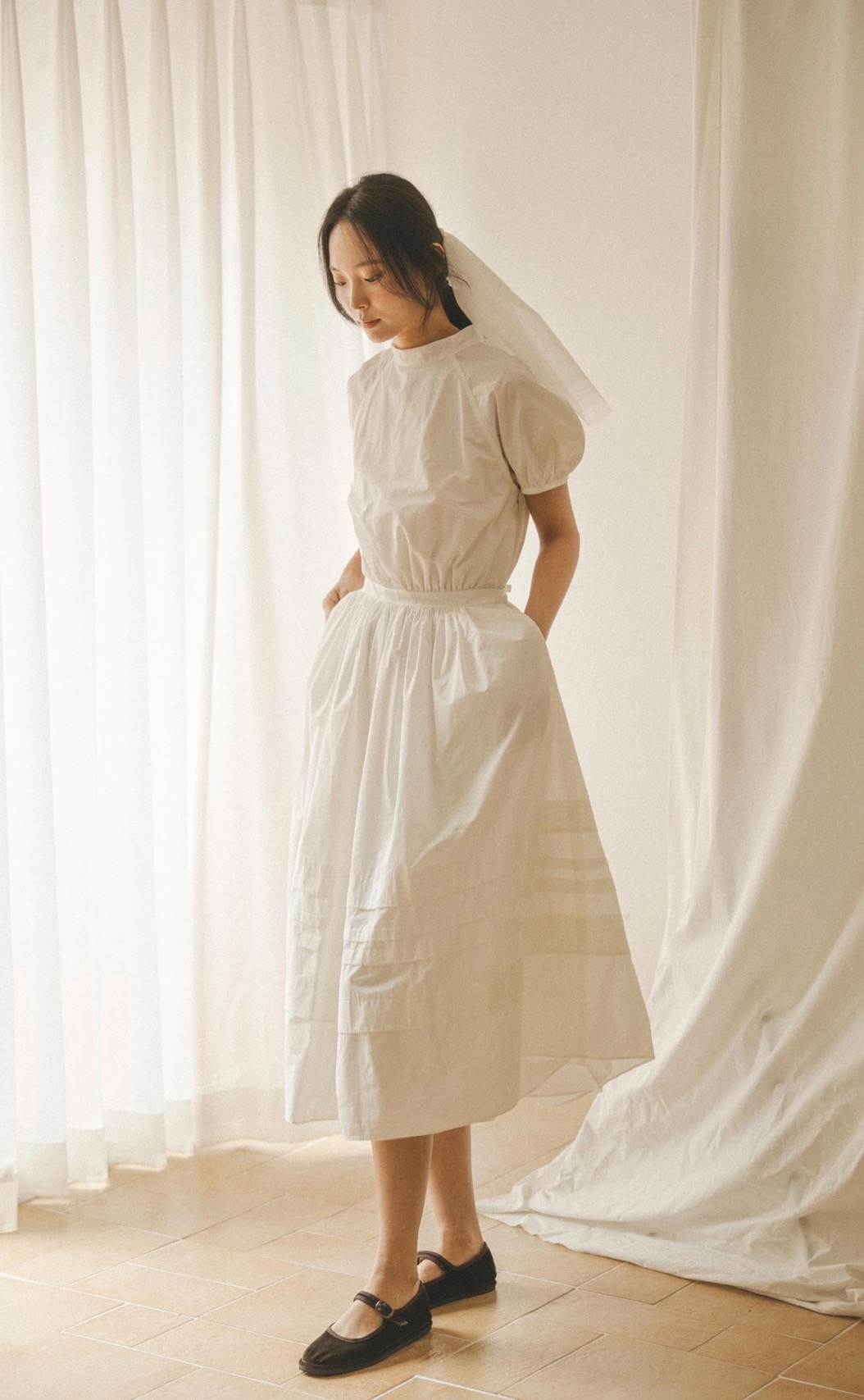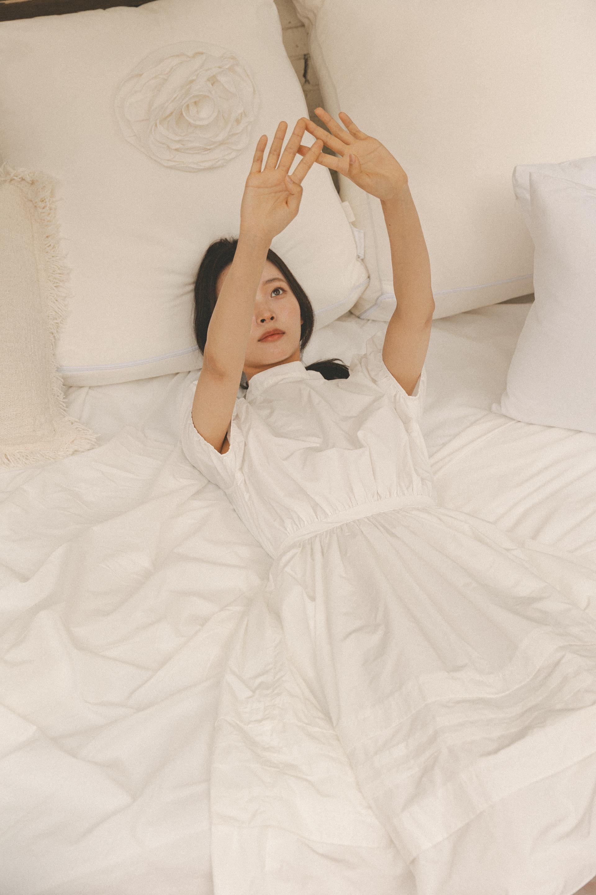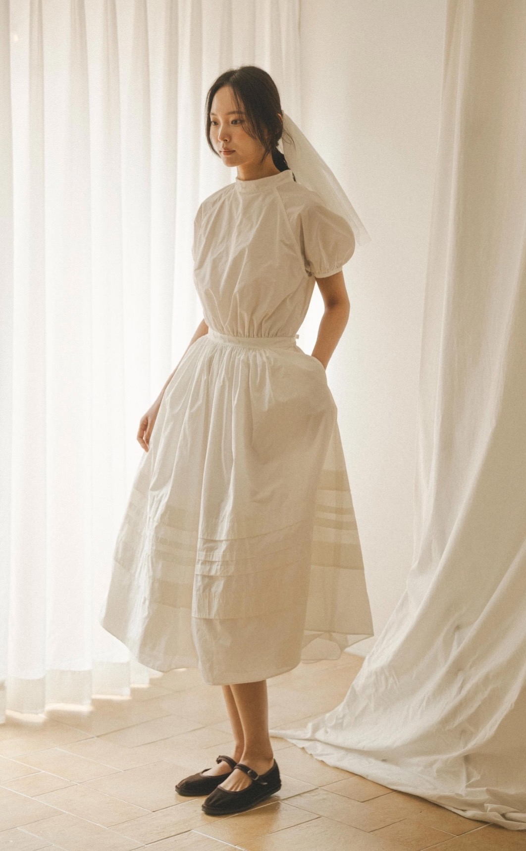 바람처럼 가볍고, 꽃잎처럼 부드러운 엘린(Elin) 드레스는 히브리어로 ‘빛나는 나무’ 혹은 ‘온화한 존재’를 의미합니다. 이 드레스는 그 이름처럼 자연스럽고, 따뜻하고, 부드러운 인상을 담고 있어요. 조임이 없는 편안한 상체 디자인은 체형의 경계를 무심히 허물고, 과하지 않은 퍼프 소매는 팔 라인을 사랑스럽게 감싸줍니다. 허리는 밴드로 되어 있어 뒷부분 리본을 묶어 마무리하면 입는 사람의 실루엣에 맞춰 여리여리한 곡선을 완성해줍니다. 발목 위로 편안하게 떨어지는 기장과 치마 하단에 더해진 턱주름은 전체적인 무드를 한층 고급스럽게 정리해줍니다. 퀄리티 봉제와 섬세한 손바느질로 완성한 엘린은 자연스러운 주름이 잡히는 바스락 거리는 소재로, 단정하고 편안함, 그리고 사랑스러움을 하나의 실루엣 안에 담아낸 드레스입니다.
