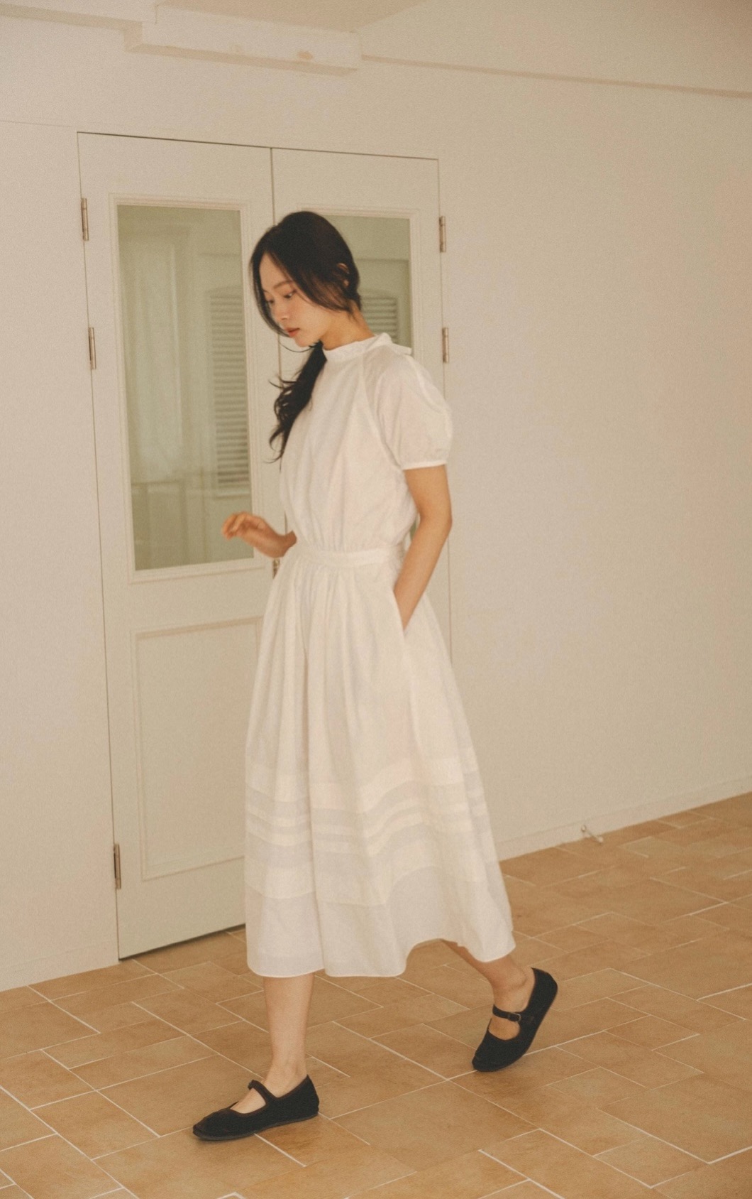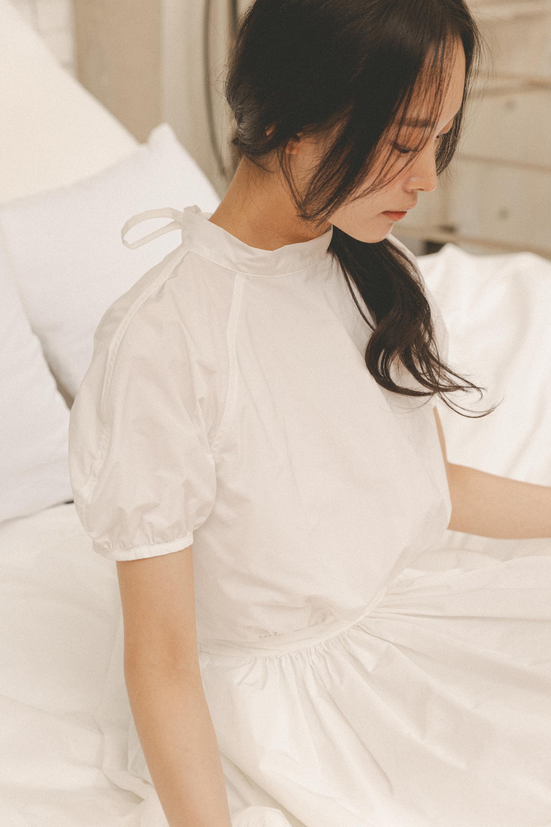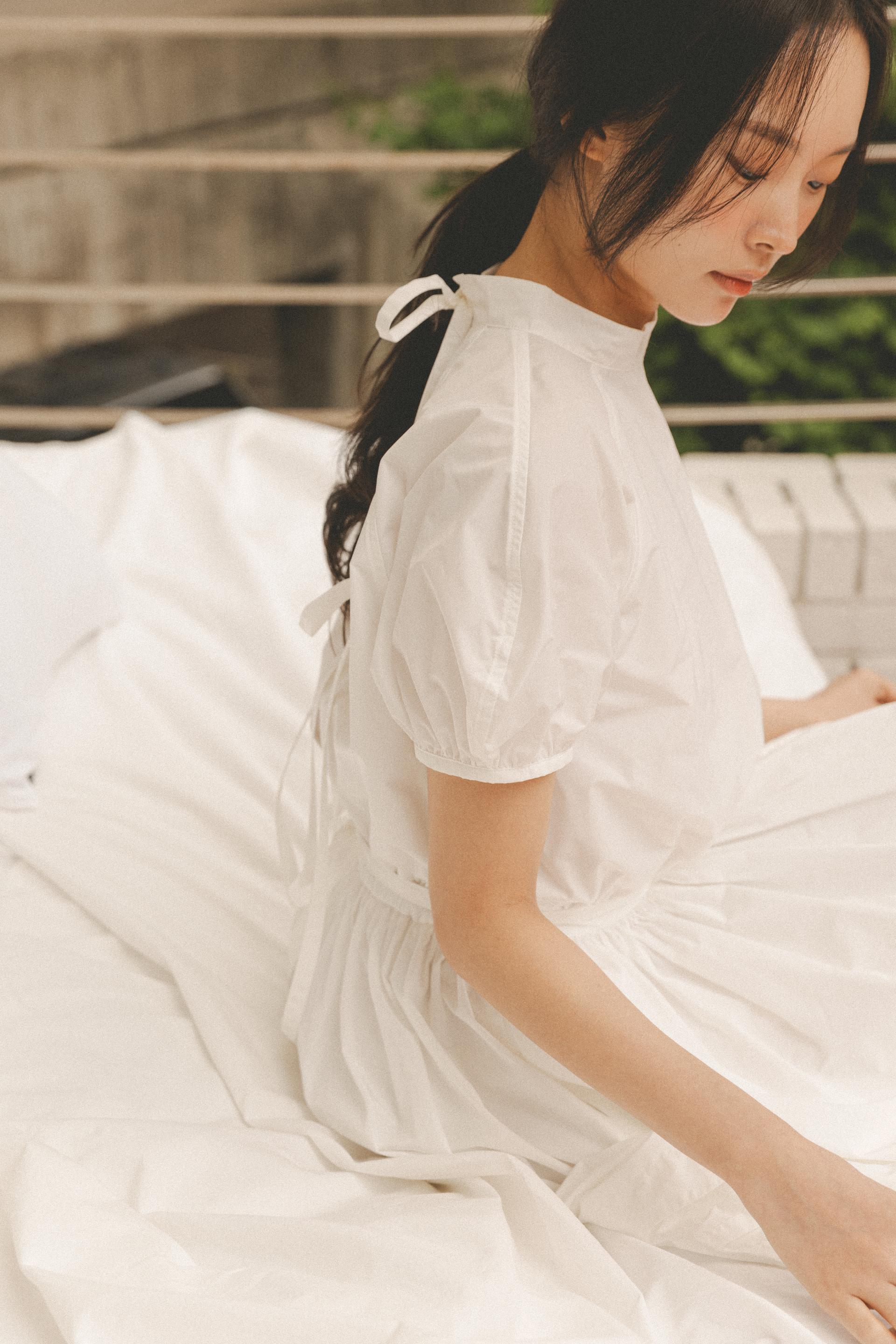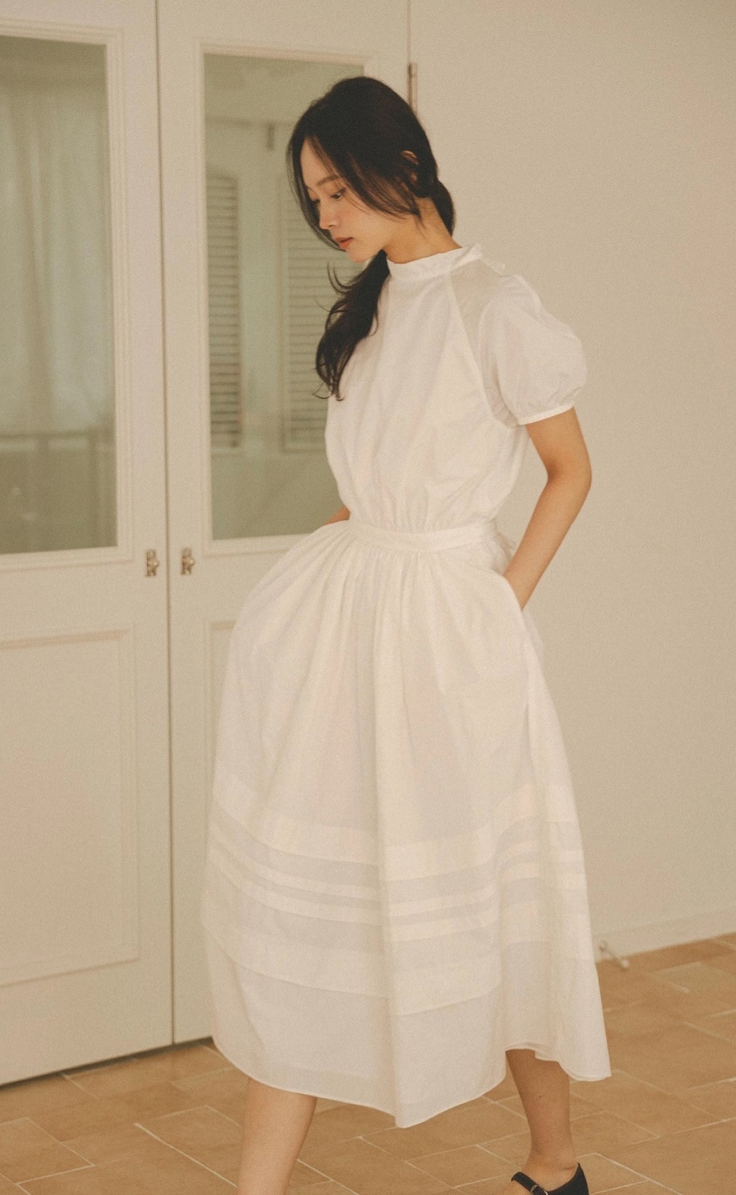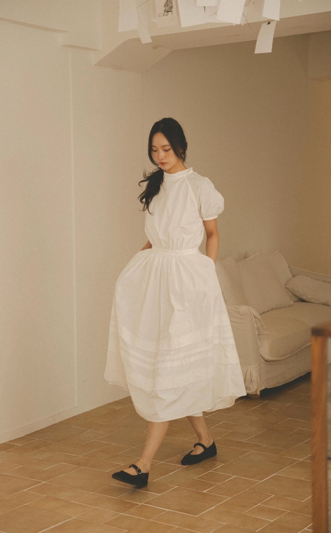 바람처럼 가볍고, 꽃잎처럼 부드러운 엘린(Elin) 드레스는 히브리어로 ‘빛나는 나무’ 혹은 ‘온화한 존재’를 의미합니다. 이 드레스는 그 이름처럼 자연스럽고, 따뜻하고, 부드러운 인상을 담고 있어요. 조임이 없는 편안한 상체 디자인은 체형의 경계를 무심히 허물고, 과하지 않은 퍼프 소매는 팔 라인을 사랑스럽게 감싸줍니다. 허리는 밴드로 되어 있어 뒷부분 리본을 묶어 마무리하면 입는 사람의 실루엣에 맞춰 여리여리한 곡선을 완성해줍니다. 발목 위로 편안하게 떨어지는 기장과 치마 하단에 더해진 턱주름은 전체적인 무드를 한층 고급스럽게 정리해줍니다. 퀄리티 봉제와 섬세한 손바느질로 완성한 엘린은 자연스러운 주름이 잡히는 바스락 거리는 소재로, 단정하고 편안함, 그리고 사랑스러움을 하나의 실루엣 안에 담아낸 드레스입니다.