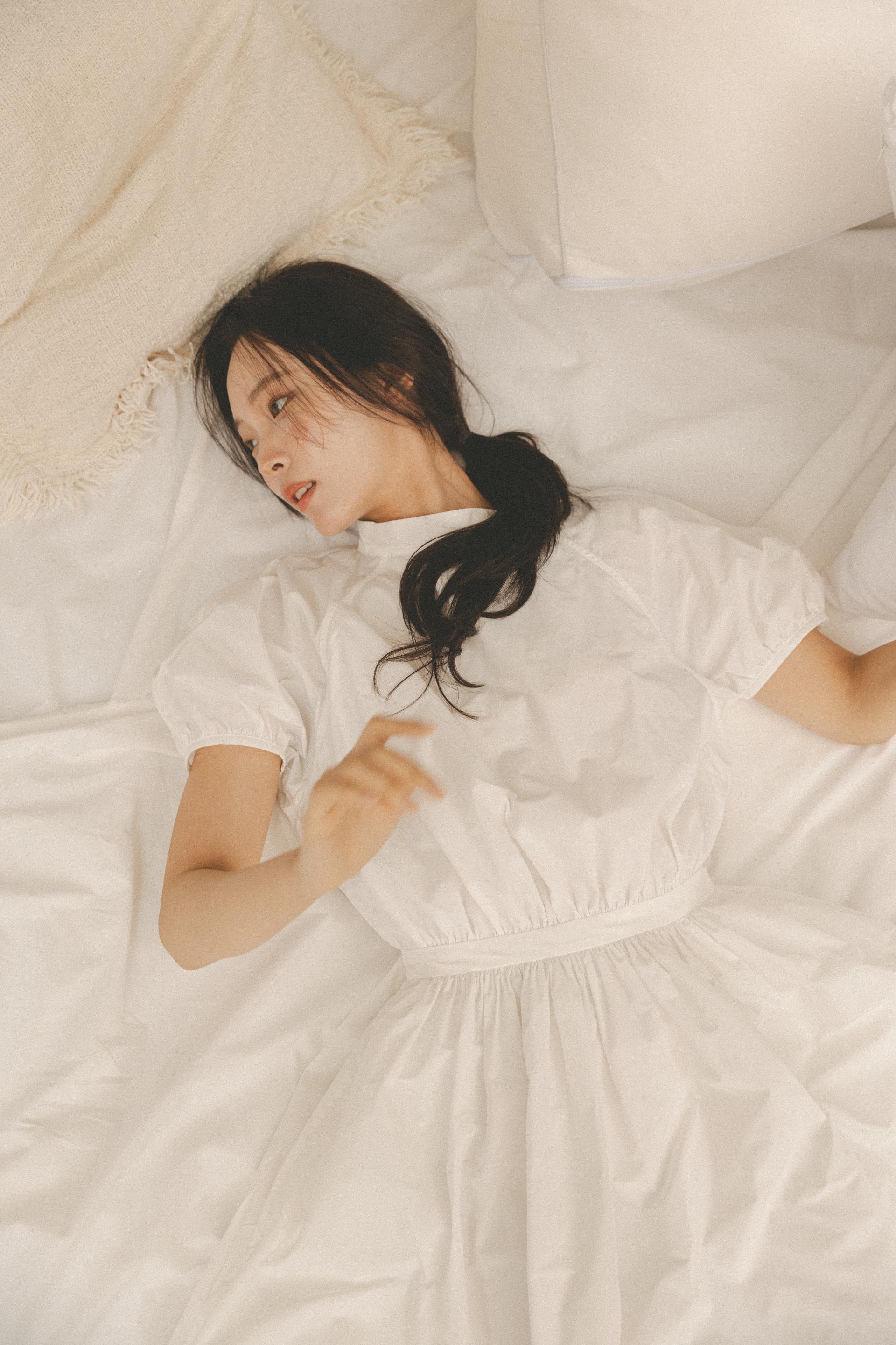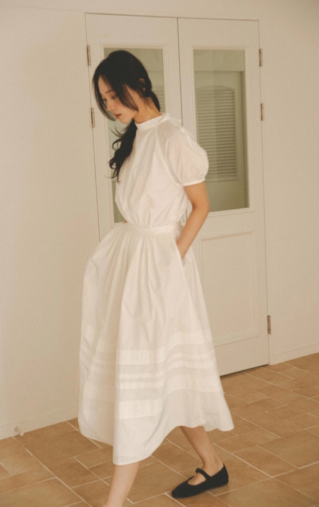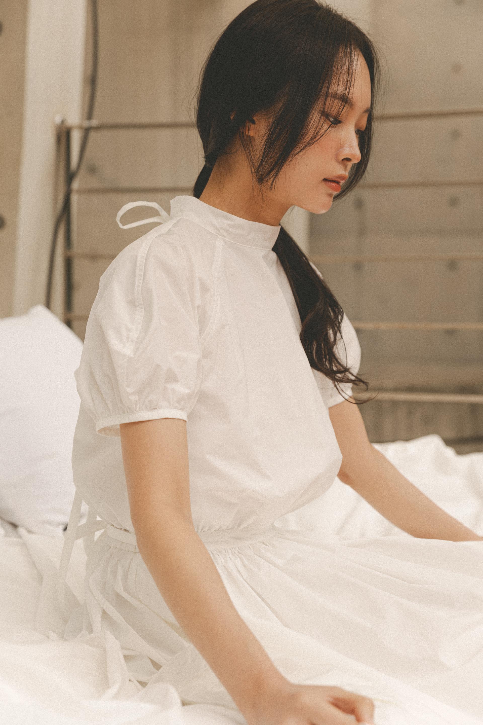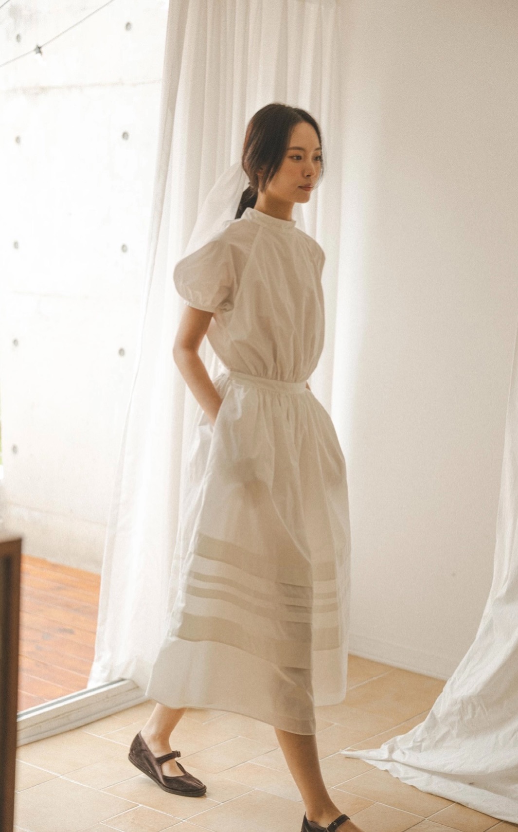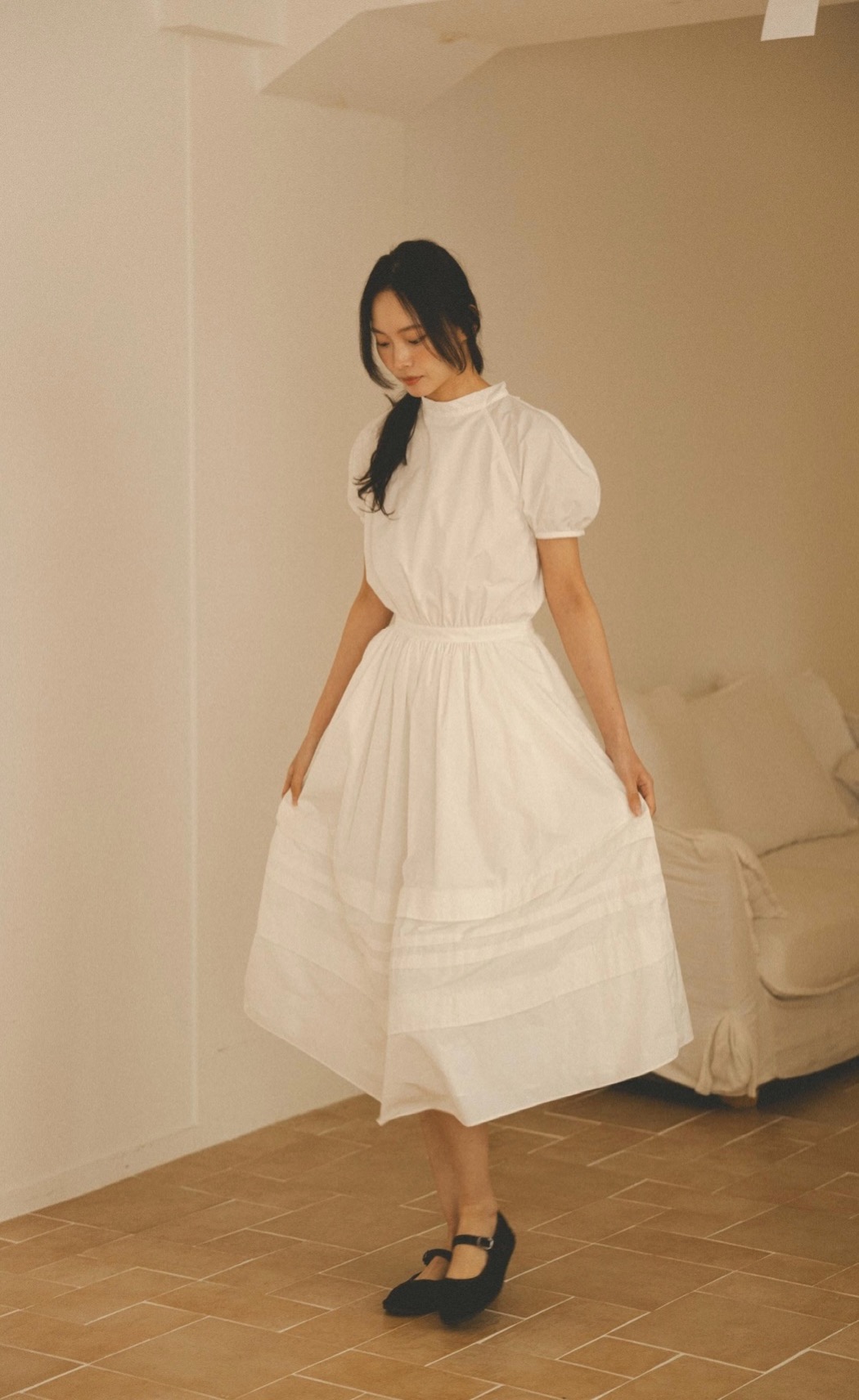 바람처럼 가볍고, 꽃잎처럼 부드러운 엘린(Elin) 드레스는 히브리어로 ‘빛나는 나무’ 혹은 ‘온화한 존재’를 의미합니다. 이 드레스는 그 이름처럼 자연스럽고, 따뜻하고, 부드러운 인상을 담고 있어요. 조임이 없는 편안한 상체 디자인은 체형의 경계를 무심히 허물고, 과하지 않은 퍼프 소매는 팔 라인을 사랑스럽게 감싸줍니다. 허리는 밴드로 되어 있어 뒷부분 리본을 묶어 마무리하면 입는 사람의 실루엣에 맞춰 여리여리한 곡선을 완성해줍니다. 발목 위로 편안하게 떨어지는 기장과 치마 하단에 더해진 턱주름은 전체적인 무드를 한층 고급스럽게 정리해줍니다. 퀄리티 봉제와 섬세한 손바느질로 완성한 엘린은 자연스러운 주름이 잡히는 바스락 거리는 소재로, 단정하고 편안함, 그리고 사랑스러움을 하나의 실루엣 안에 담아낸 드레스입니다.