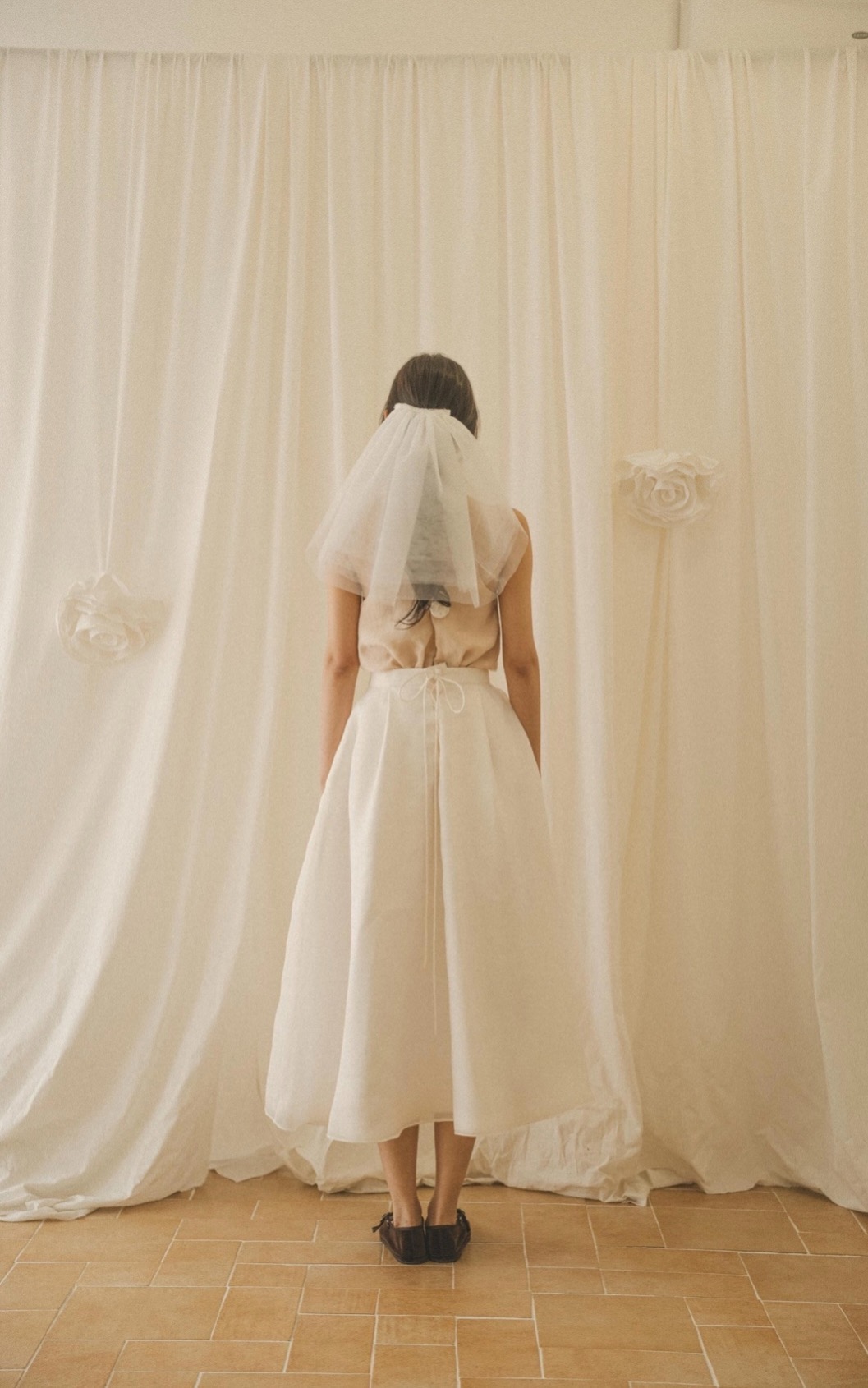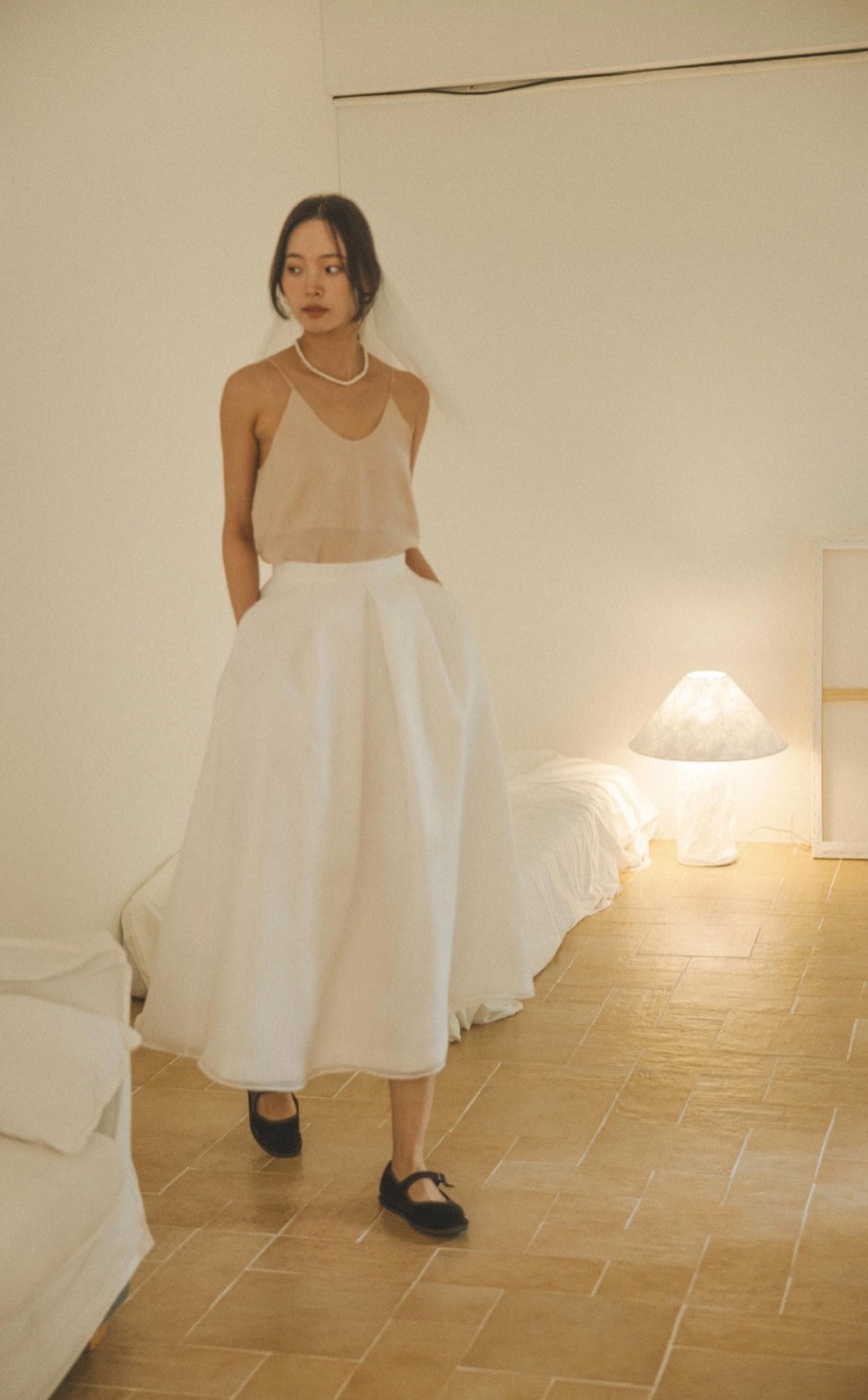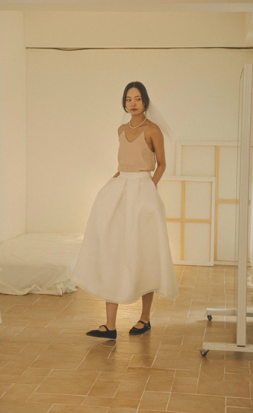 우아하게 흐르며, 흔들림 없는 아름다움. 마리 스커트는 움직일 때마다 자연스럽게 살아나는 풍성한 실루엣이 인상적인 스커트입니다. 두 겹의 원단을 덧대어 깊이 있는 볼륨을 표현했고, 허리 뒷면은 코르셋 마감으로 체형에 따라 자유롭게 조절이 가능합니다. 무릎 위 기장과 안정적인 착용감, 그리고 실용적인 주머니로 편안함을 더했습니다. 스몰 웨딩이나 브라이덜 스냅 촬영, 또는 나만의 특별한 날을 위한 ‘드레스다운’ 아이템으로 추천드리는 스커트입니다.